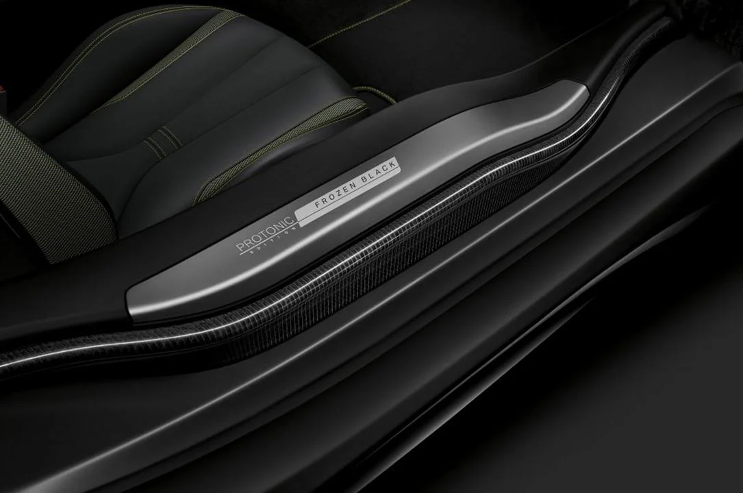 The Frozen Black paint finish is combined with gloss black fascia inserts for a dark look all around. In the cabin, bright yellow contrast stitching is found on the seats and center console, alongside Protonic Frozen Black lettering on the doorsills.